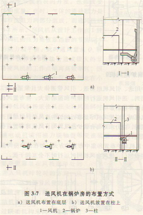 如鍋爐房是單層建筑,風機的位置應不妨礙司爐工的操作;如鍋爐房是多層建筑,則風機應布置在底層。對于體型較小和重量較輕的送風機,也可以放置在鍋爐房承重柱上面,以節(jié)省風管和減少阻力,但運行操作較不方便。如圖所示為送風機在鍋爐房的布置方式。